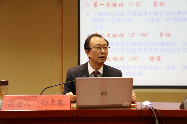 孙大敏以《全面建设社会主义现代化国家的科学指南和基本遵循》为主题,从“关于十九届五中全会;全会的背景:成就与百年变局;全会的目标:五年与十五年;“十四五”主要工作:12个方面重大举措”四个部分,对全会精神作了系统阐述和深刻讲解。